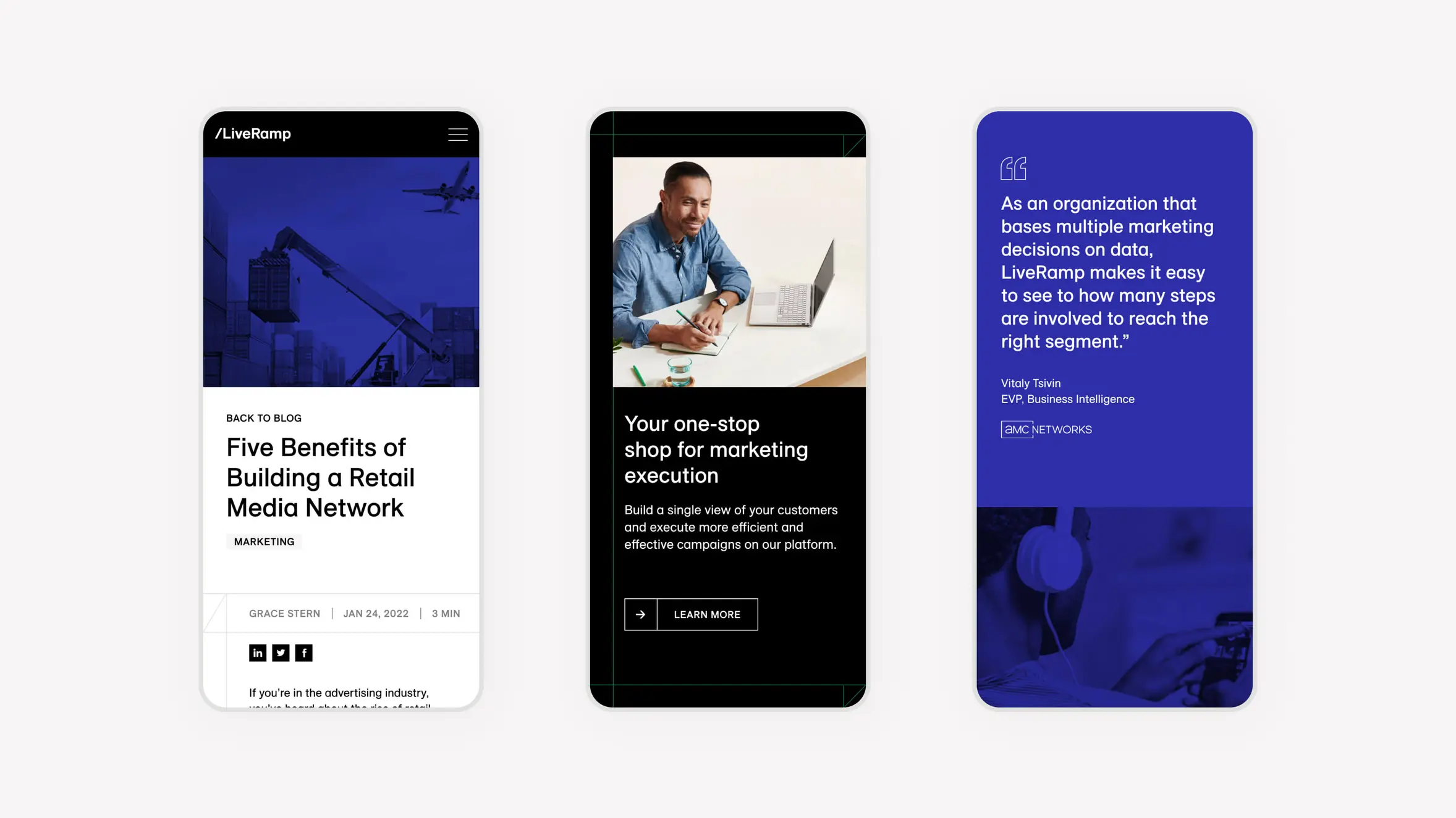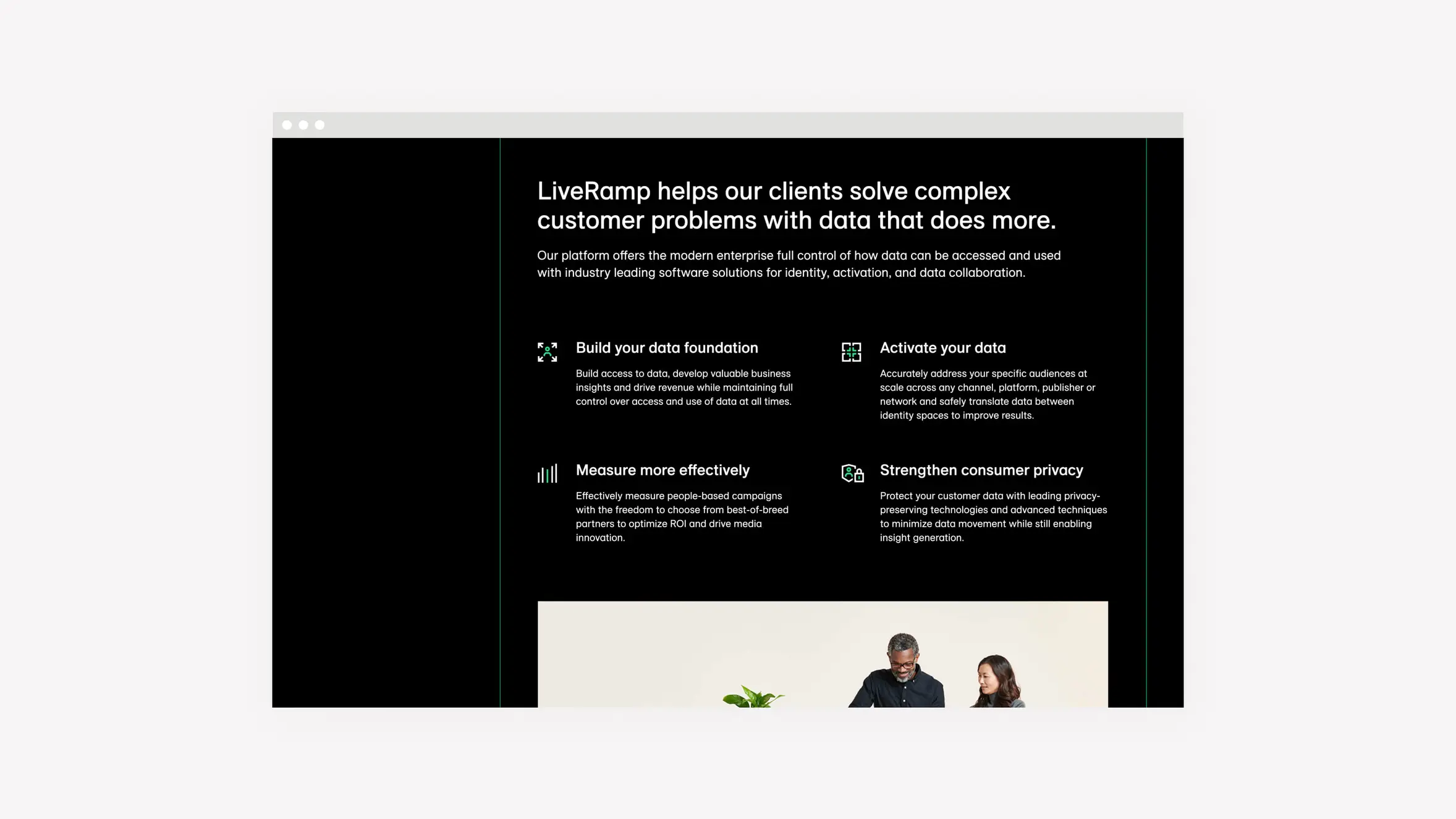 The new website needed to create an optimal, customer-first experience, including simplifying complex ideas and concepts and providing clarity around LiveRamp’s benefits for customers, in keeping with their new brand promise: ‘No Compromises’.
