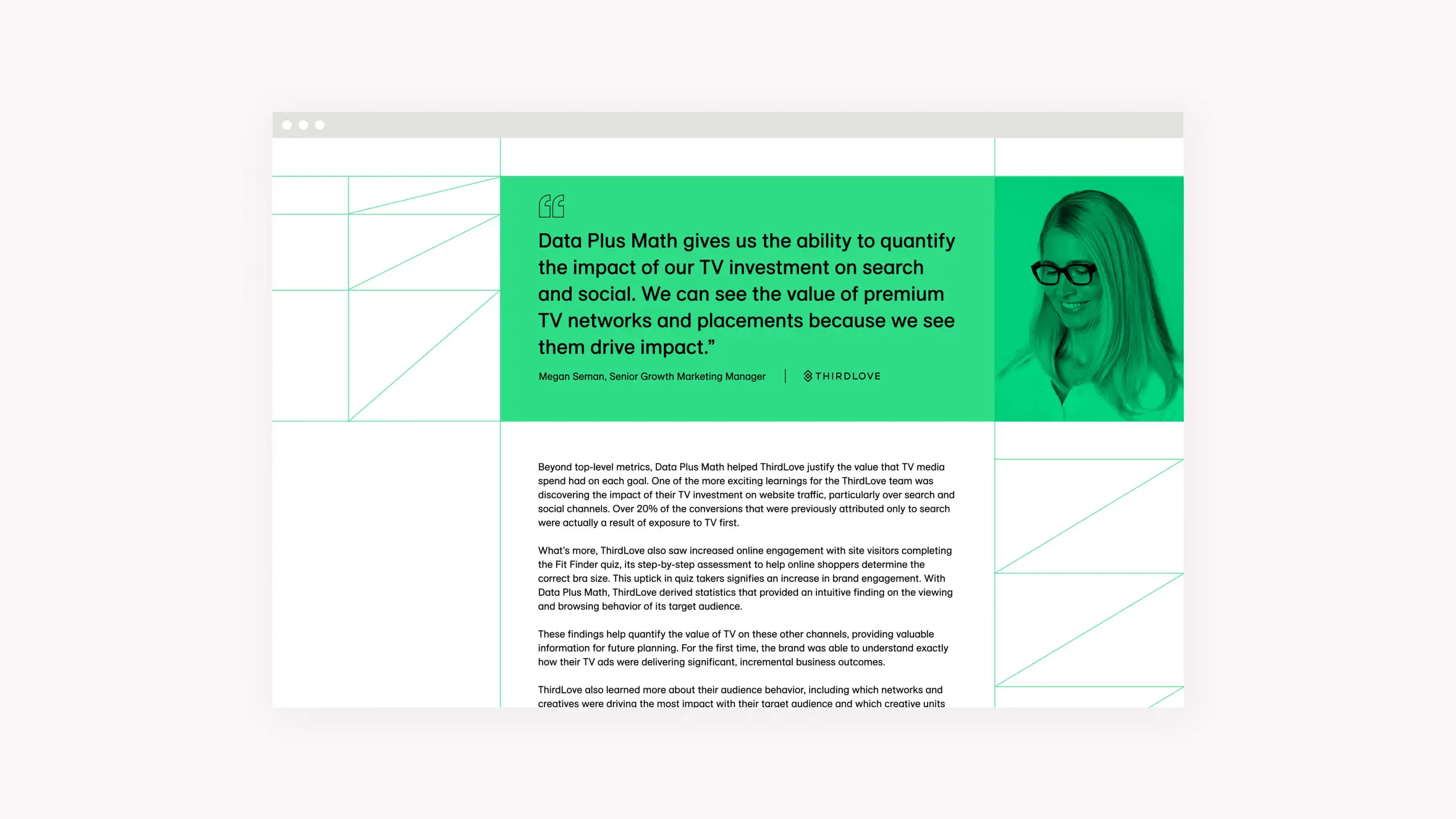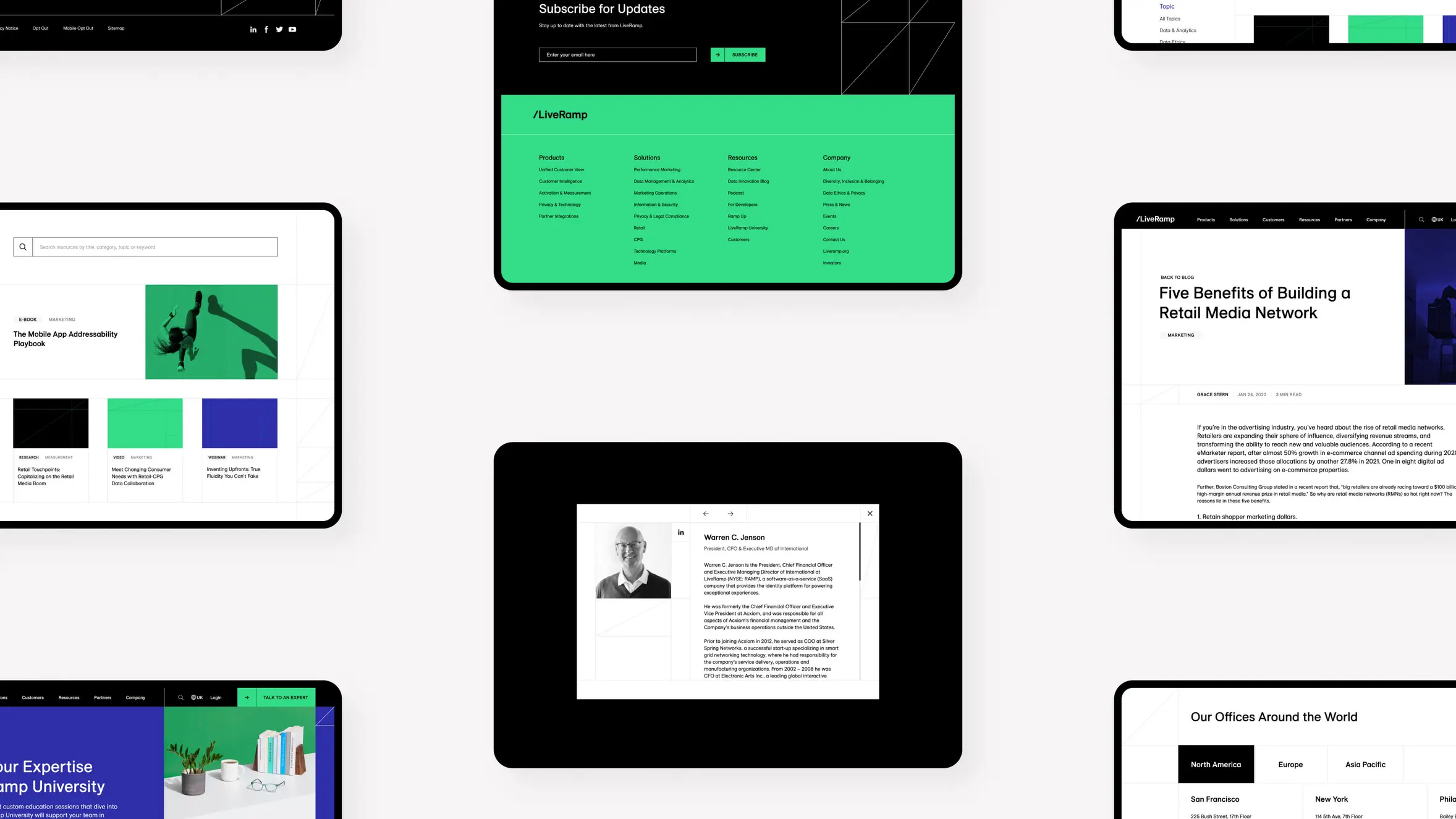 LiveRamp’s new website needed to embody their brand essence: ‘Radical Simplicity’. We designed the site around a grid system to symbolize flexibility and establish a feeling of interconnectivity, resulting in a single, continuous flow for visitors. Seamless and intuitive UI and UX, including pinning a section of the product on the homepage, contributes to a unified story throughout the site. A significant number of custom elements, including cohesive (but not repetitive) templates, were built and implemented for a tight launch timeline.