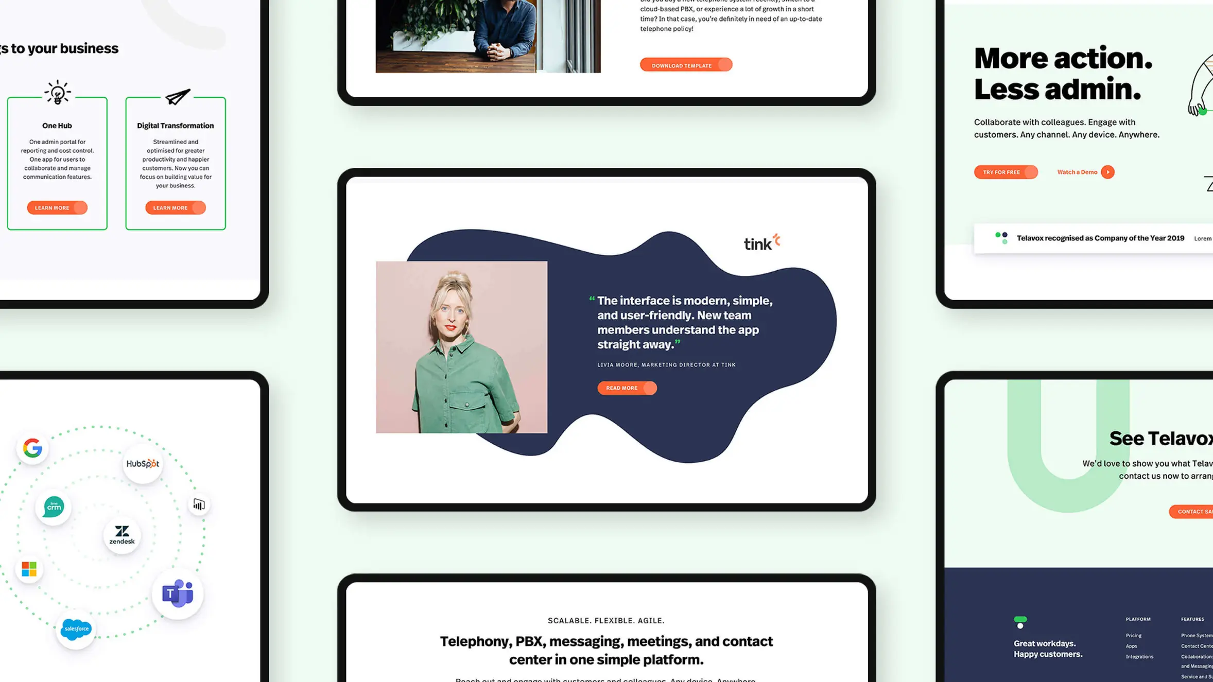 We began an in-depth discovery process, complete with internal and external stakeholder interviews, to uncover what defined Telavox: easy-to-use products built to create truly happy customers. All brand elements needed to reflect these fundamental facets of their identity. We focused design around a minimal palette (purposefully economical to mirror the ease of Telavox products), plus strong graphic elements, including hand-drawn illustrations to add a human touch. Messaging was simple and powerful: crisp sentences, no jargon, and direct explanations of complex ideas to clearly show the customer how the platform could improve their workday.